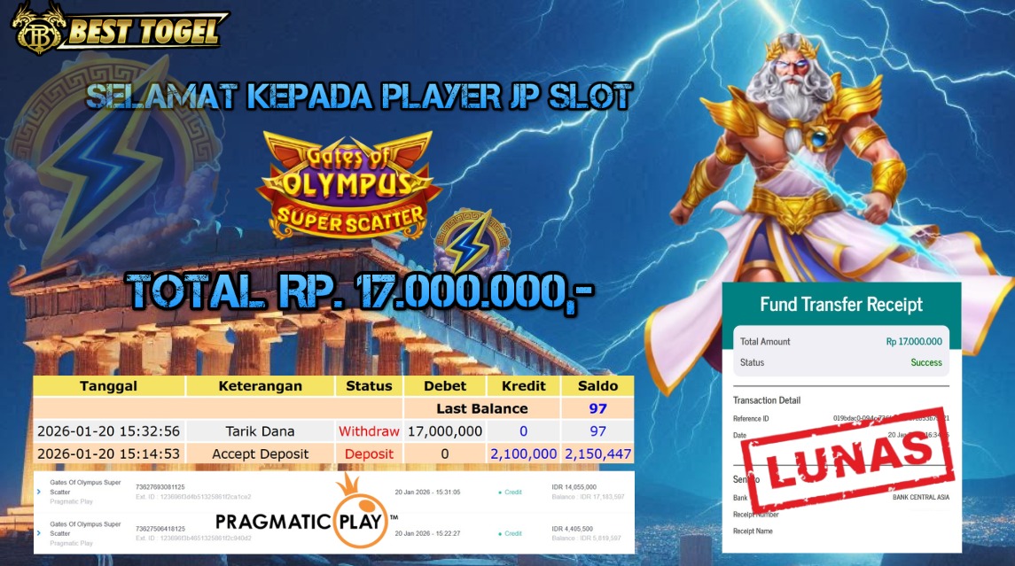 Selamat kepada User id : KSY****** Telah berhasil mendapatkan kemenangan besar pada permainan SLOT GATES OF OLYMPUS SUPER SCATTER dengan total kemenangan Sebesar Rp.17.000.000,– Setelah mengisi formulir withdraw dengan kurung waktu hanya 5 – 10 menit pihak BESTTOGEL sudah melakukan transfer kepada pemilik Userid dan dana sudah dapat di cairkan oleh pemenang. Bukti pembayaran yang kami berikan merupakan bukti pembayaran yang SAH / VALID yang langung di dapatkan melaui tanda transfer transaksi dari Bank yang di tuju.