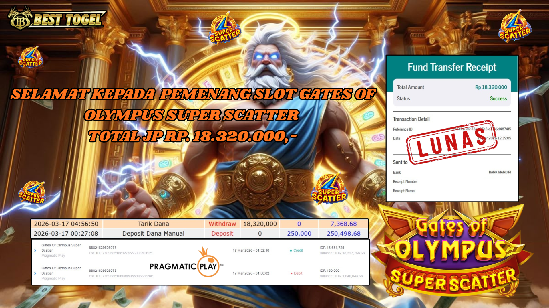 BUKTI JACKPOT SLOT GATES OF OLYMPUS SUPER SCATTER RP. 18.320.000,- LUNAS