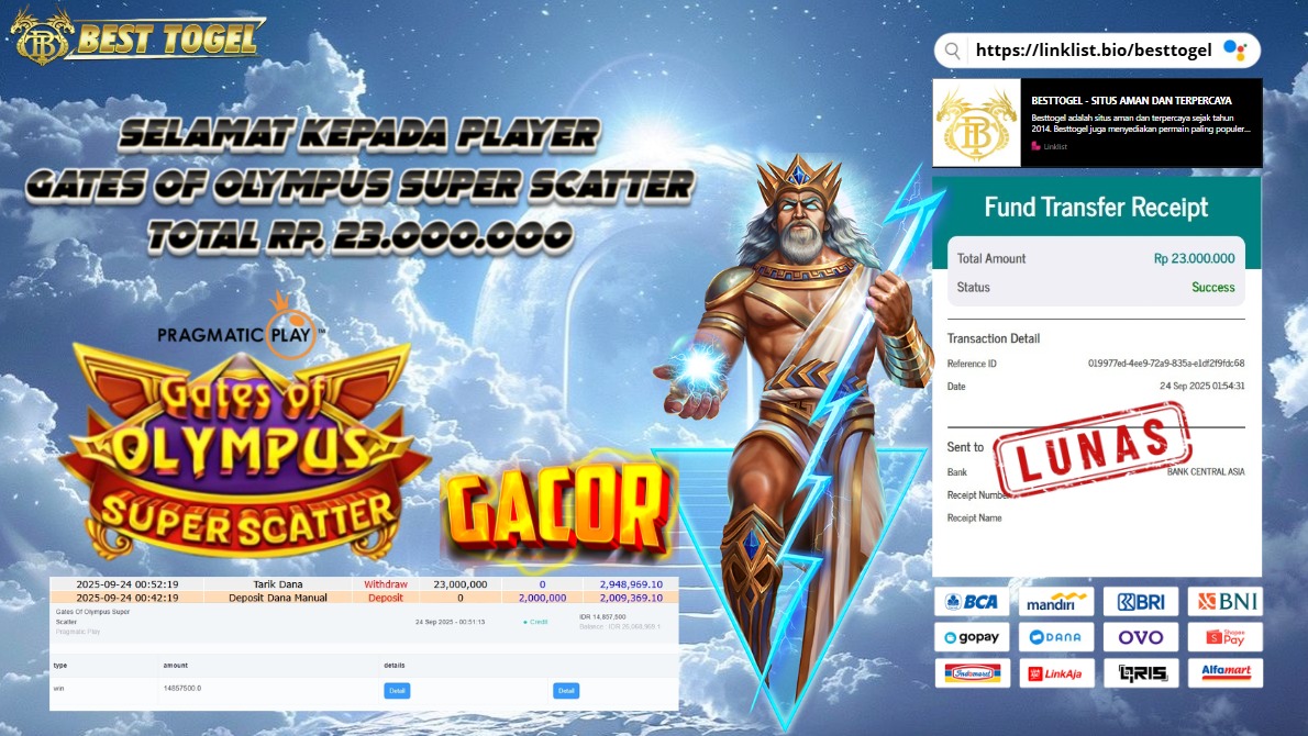 kepada User id : DKB****** Telah berhasil mendapatkan kemenangan besar pada permainan SLOT GATES OF OLYMPUS SUPER SCATTER dengan total kemenangan Sebesar Rp. 23.000.000,- Setelah mengisi formulir withdraw dengan kurung waktu hanya 5 – 10 menit pihak BESTTOGEL sudah melakukan transfer kepada pemilik Userid dan dana sudah dapat di cairkan oleh pemenang. Bukti pembayaran yang kami berikan merupakan bukti pembayaran yang SAH / VALID yang langung di dapatkan melaui tanda transfer transaksi dari Bank yang di tuju.