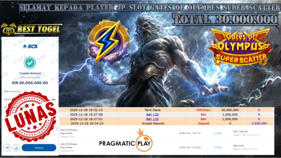 Selamat kepada User id : JQM****** Telah berhasil mendapatkan kemenangan besar pada permainan SLOT GATES OF OLYMPUS SUPER SCATTER dengan total kemenangan Sebesar Rp. 30.000.000,- Setelah mengisi formulir withdraw dengan kurung waktu hanya 5 – 10 menit pihak BESTTOGEL sudah melakukan transfer kepada pemilik Userid dan dana sudah dapat di cairkan oleh pemenang. Bukti pembayaran yang kami berikan merupakan bukti pembayaran yang SAH / VALID yang langung di dapatkan melaui tanda transfer transaksi dari Bank yang di tuju.
