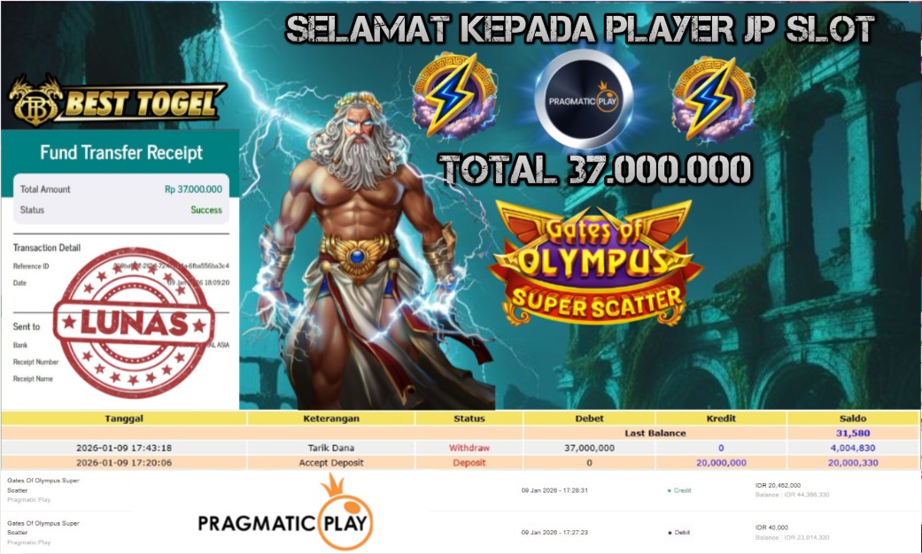 Selamat kepada User id : ASR****** Telah berhasil mendapatkan kemenangan besar pada permainan SLOT GATES OF OLYMPUS SUPER SCATTER dengan total kemenangan Sebesar Rp.37.000.000,– Setelah mengisi formulir withdraw dengan kurung waktu hanya 5 – 10 menit pihak BESTTOGEL sudah melakukan transfer kepada pemilik Userid dan dana sudah dapat di cairkan oleh pemenang. Bukti pembayaran yang kami berikan merupakan bukti pembayaran yang SAH / VALID yang langung di dapatkan melaui tanda transfer transaksi dari Bank yang di tuju.