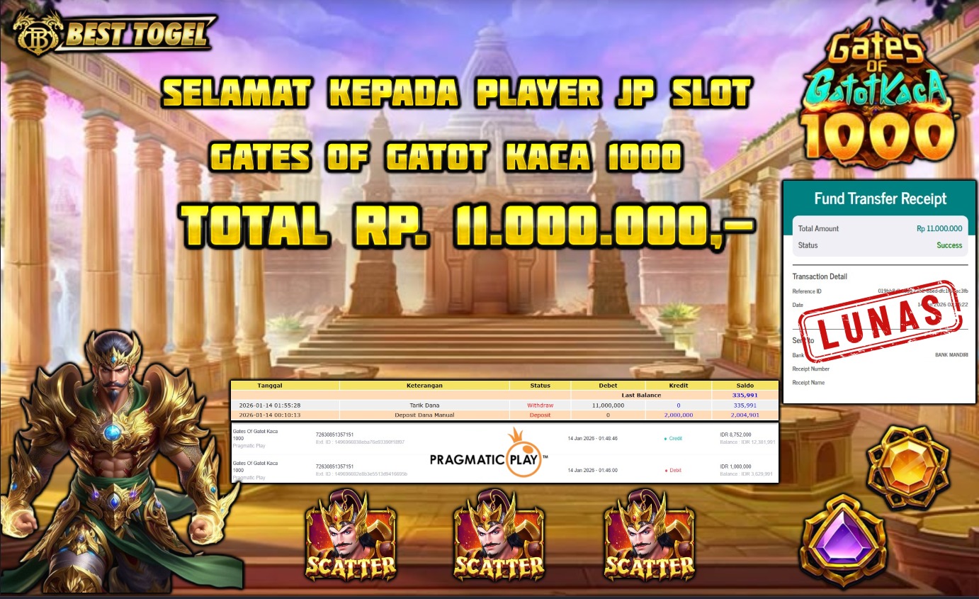 Selamat kepada User id : WHE****** Telah berhasil mendapatkan kemenangan besar pada permainan SLOT GATOT KACA 1000 dengan total kemenangan Sebesar Rp.11.000.000,– Setelah mengisi formulir withdraw dengan kurung waktu hanya 5 – 10 menit pihak BESTTOGEL sudah melakukan transfer kepada pemilik Userid dan dana sudah dapat di cairkan oleh pemenang. Bukti pembayaran yang kami berikan merupakan bukti pembayaran yang SAH / VALID yang langung di dapatkan melaui tanda transfer transaksi dari Bank yang di tuju.