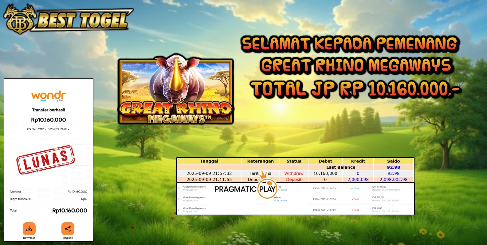kepada User id : KAK***** Telah berhasil mendapatkan kemenangan besar pada permainan SLOT GREAT RHINO MEGAWAYS dengan total kemenangan Sebesar Rp. 10.160.000,00- Setelah mengisi formulir withdraw dengan kurung waktu hanya 5 – 10 menit pihak BESTTOGEL sudah melakukan transfer kepada pemilik Userid dan dana sudah dapat di cairkan oleh pemenang. Bukti pembayaran yang kami berikan merupakan bukti pembayaran yang SAH / VALID yang langung di dapatkan melaui tanda transfer transaksi dari Bank yang di tuju.