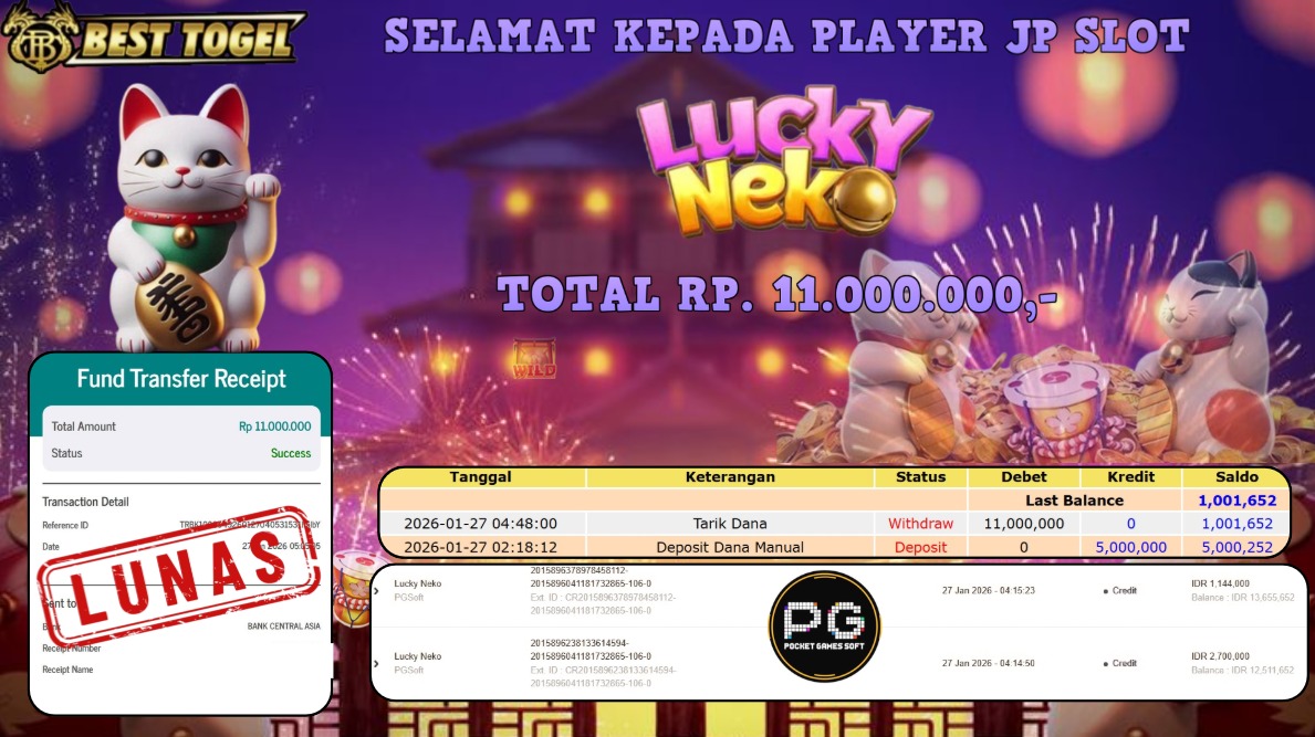 Selamat kepada User id : KAB****** Telah berhasil mendapatkan kemenangan besar pada permainan SLOT LUCKY NEKO dengan total kemenangan Sebesar Rp.11.000.000,– Setelah mengisi formulir withdraw dengan kurung waktu hanya 5 – 10 menit pihak BESTTOGEL sudah melakukan transfer kepada pemilik Userid dan dana sudah dapat di cairkan oleh pemenang. Bukti pembayaran yang kami berikan merupakan bukti pembayaran yang SAH / VALID yang langung di dapatkan melaui tanda transfer transaksi dari Bank yang di tuju.