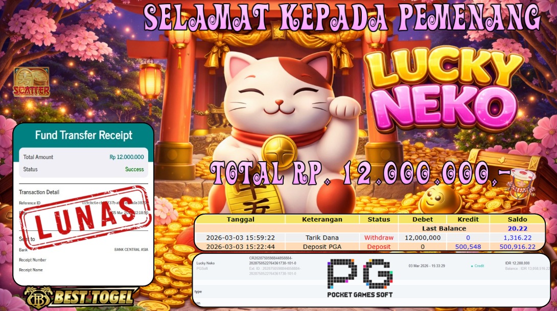 BUKTI JACKPOT SLOT LUCKY NEKO RP.12.000.000,- LUNAS