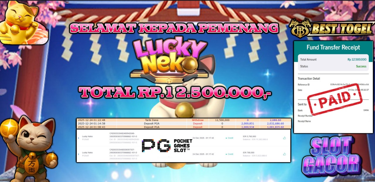 kepSelamatada User id : BAS****** Telah berhasil mendapatkan kemenangan besar pada permainan SLOT LUCKY NEKO dengan total kemenangan Sebesar Rp. 12.500.000,- Setelah mengisi formulir withdraw dengan kurung waktu hanya 5 – 10 menit pihak BESTTOGEL sudah melakukan transfer kepada pemilik Userid dan dana sudah dapat di cairkan oleh pemenang. Bukti pembayaran yang kami berikan merupakan bukti pembayaran yang SAH / VALID yang langung di dapatkan melaui tanda transfer transaksi dari Bank yang di tuju.