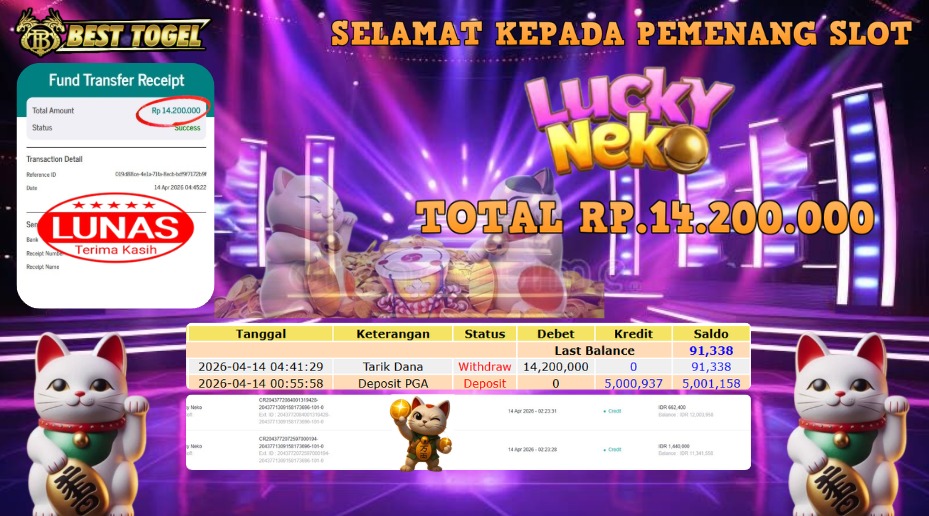 BUKTI JACKPOT SLOT LUCKY NEKO RP.14,200,000,- LUNAS