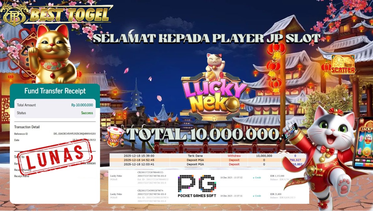 Selamat kepada User id : DOQ****** Telah berhasil mendapatkan kemenangan besar pada permainan SLOT LUCKY NEKO dengan total kemenangan Sebesar Rp. 10.000.000 ,- Setelah mengisi formulir withdraw dengan kurung waktu hanya 5 – 10 menit pihak BESTTOGEL sudah melakukan transfer kepada pemilik Userid dan dana sudah dapat di cairkan oleh pemenang. Bukti pembayaran yang kami berikan merupakan bukti pembayaran yang SAH / VALID yang langung di dapatkan melaui tanda transfer transaksi dari Bank yang di tuju.