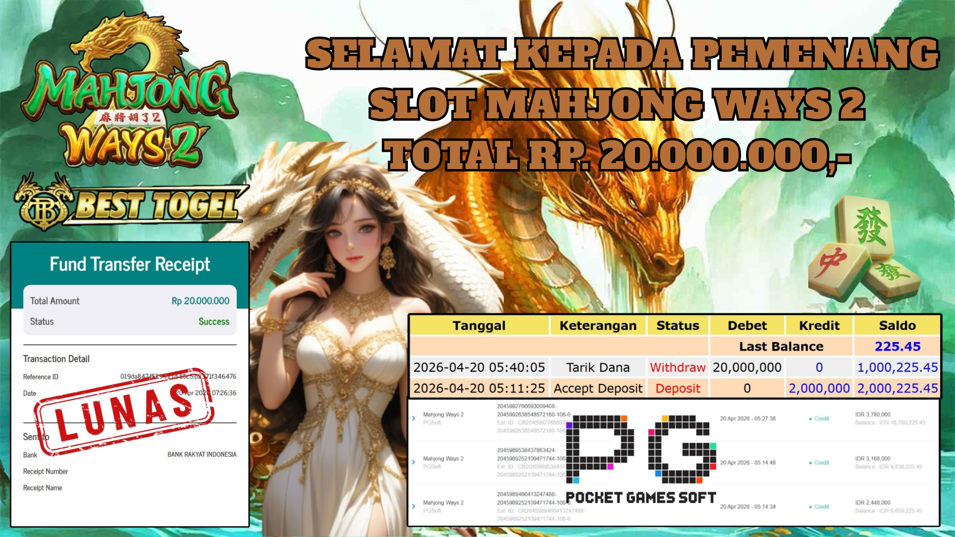 Selamat kepada User id : TRI*** Telah berhasil mendapatkan kemenangan besar pada permainanan SLOT MAHJONG WAYS 2 dengan total kemenangan Sebesar Rp.20.000.000,- Setelah mengisi formulir withdraw dengan kurung waktu hanya 5 – 10 menit pihak BESTTOGEL sudah melakukan transfer kepada pemilik Userid dan dana sudah dapat di cairkan oleh pemenang. Bukti pembayaran yang kami berikan merupakan bukti pembayaran yang SAH / VALID yang langung di dapatkan melaui tanda transfer transaksi dari Bank yang di tuju.Kami mengucapakan banyak Terima Kasih Kepada pemenang karena sudah mempercayakan kami sebagai Bandar Tepercaya yang membayar semua kemenangan member