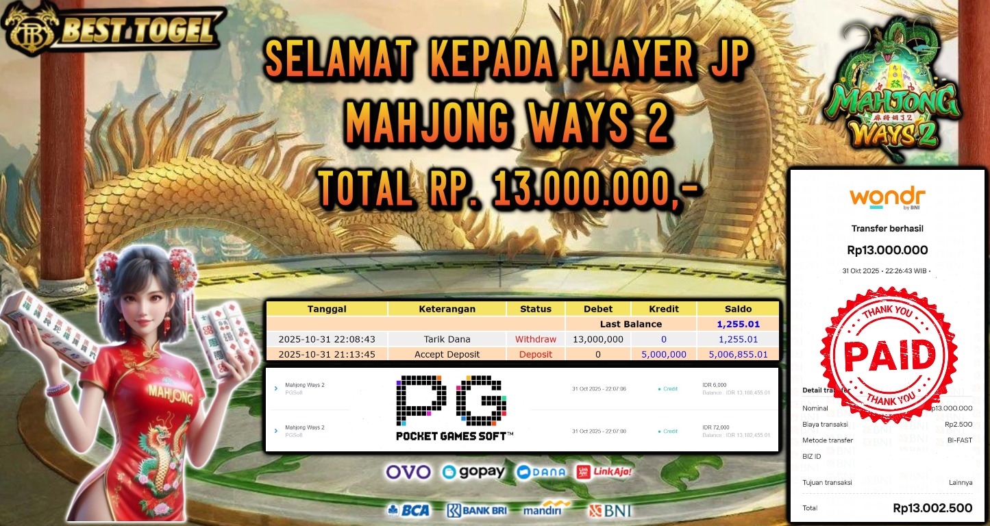 Selamat kepada User id : NGU****** Telah berhasil mendapatkan kemenangan besar pada permainan SLOT MAHJONG WAYS 2 dengan total kemenangan Sebesar Rp 13.000.000 ,- Setelah mengisi formulir withdraw dengan kurung waktu hanya 5 – 10 menit pihak BESTTOGEL sudah melakukan transfer kepada pemilik Userid dan dana sudah dapat di cairkan oleh pemenang. Bukti pembayaran yang kami berikan merupakan bukti pembayaran yang SAH / VALID yang langung di dapatkan melaui tanda transfer transaksi dari Bank yang di tuju.