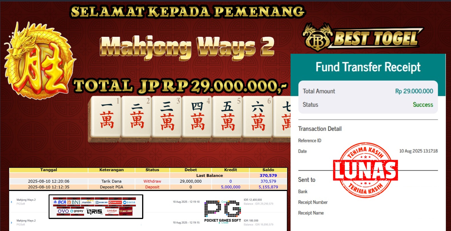 kepada User id : KEL***** Telah berhasil mendapatkan kemenangan besar pada permainan SLOT MAHJONG WAYS 2 dengan total kemenangan Sebesar Rp. 29.000.000,00- Setelah mengisi formulir withdraw dengan kurung waktu hanya 5 – 10 menit pihak BESTTOGEL sudah melakukan transfer kepada pemilik Userid dan dana sudah dapat di cairkan oleh pemenang. Bukti pembayaran yang kami berikan merupakan bukti pembayaran yang SAH / VALID yang langung di dapatkan melaui tanda transfer transaksi dari Bank yang di tuju.