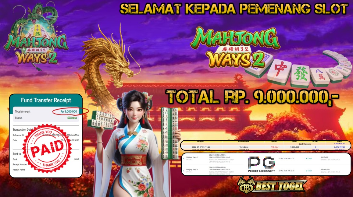 Selamat kepada User id : SYA****** Telah berhasil mendapatkan kemenangan besar pada permainanan  SLOT MAHJONG WAYS 2  dengan total kemenangan Sebesar Rp. 9.000.000,– Setelah mengisi formulir withdraw dengan kurung waktu hanya 5 – 10 menit pihak  BESTTOGEL sudah melakukan transfer kepada pemilik Userid dan dana sudah dapat di cairkan oleh pemenang. Bukti pembayaran yang kami berikan merupakan bukti pembayaran yang SAH / VALID yang langung di dapatkan melaui tanda transfer transaksi dari Bank yang di tuju.Kami mengucapakan banyak Terima Kasih Kepada pemenang karena sudah mempercayakan kami sebagai Bandar Tepercaya yang membayar semua kemenangan member