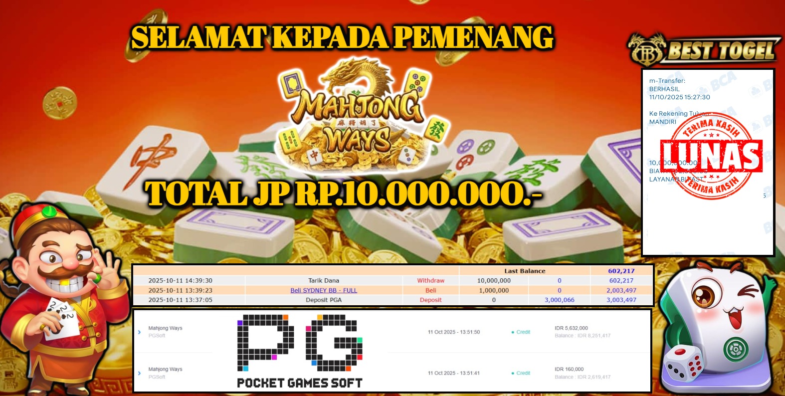 Kepada User id : FIL****** Telah berhasil mendapatkan kemenangan besar pada permainan SLOT MAHJONG WAYS dengan total kemenangan Sebesar Rp. 10.000.000,- Setelah mengisi formulir withdraw dengan kurung waktu hanya 5 – 10 menit pihak BESTTOGEL sudah melakukan transfer kepada pemilik Userid dan dana sudah dapat di cairkan oleh pemenang. Bukti pembayaran yang kami berikan merupakan bukti pembayaran yang SAH / VALID yang langung di dapatkan melaui tanda transfer transaksi dari Bank yang di tuju.