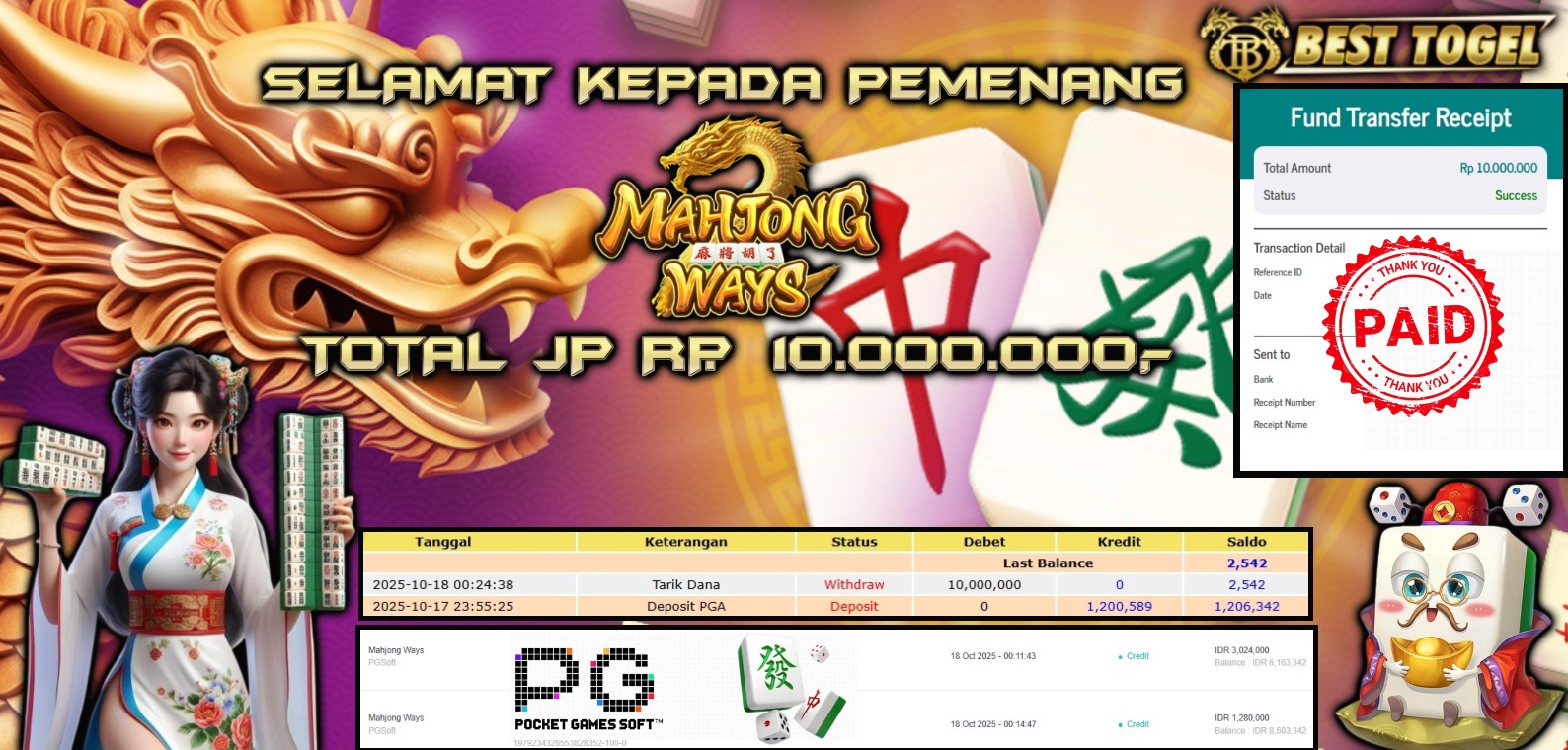 kepada User id : NUR****** Telah berhasil mendapatkan kemenangan besar pada permainan SLOT MAHJONG WAYS dengan total kemenangan Sebesar Rp. 10.000.000,-  Setelah mengisi formulir withdraw dengan kurung waktu hanya 5 – 10 menit pihak BESTTOGEL sudah melakukan transfer kepada pemilik Userid dan dana sudah dapat di cairkan oleh pemenang. Bukti pembayaran yang kami berikan merupakan bukti pembayaran yang SAH / VALID yang langung di dapatkan melaui tanda transfer transaksi dari Bank yang di tuju.