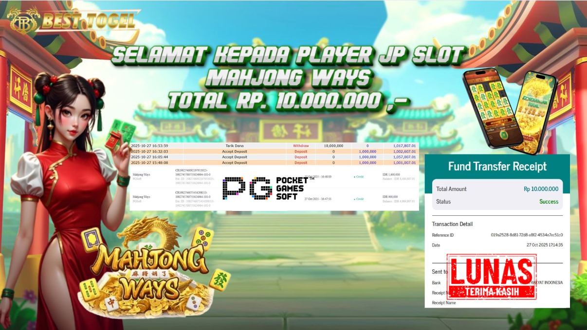Selamat kepada User id : LZH****** Telah berhasil mendapatkan kemenangan besar pada permainan SLOT MAHJONG WAYS dengan total kemenangan Sebesar Rp 10.000.000,- Setelah mengisi formulir withdraw dengan kurung waktu hanya 5 – 10 menit pihak BESTTOGEL sudah melakukan transfer kepada pemilik Userid dan dana sudah dapat di cairkan oleh pemenang. Bukti pembayaran yang kami berikan merupakan bukti pembayaran yang SAH / VALID yang langung di dapatkan melaui tanda transfer transaksi dari Bank yang di tuju.