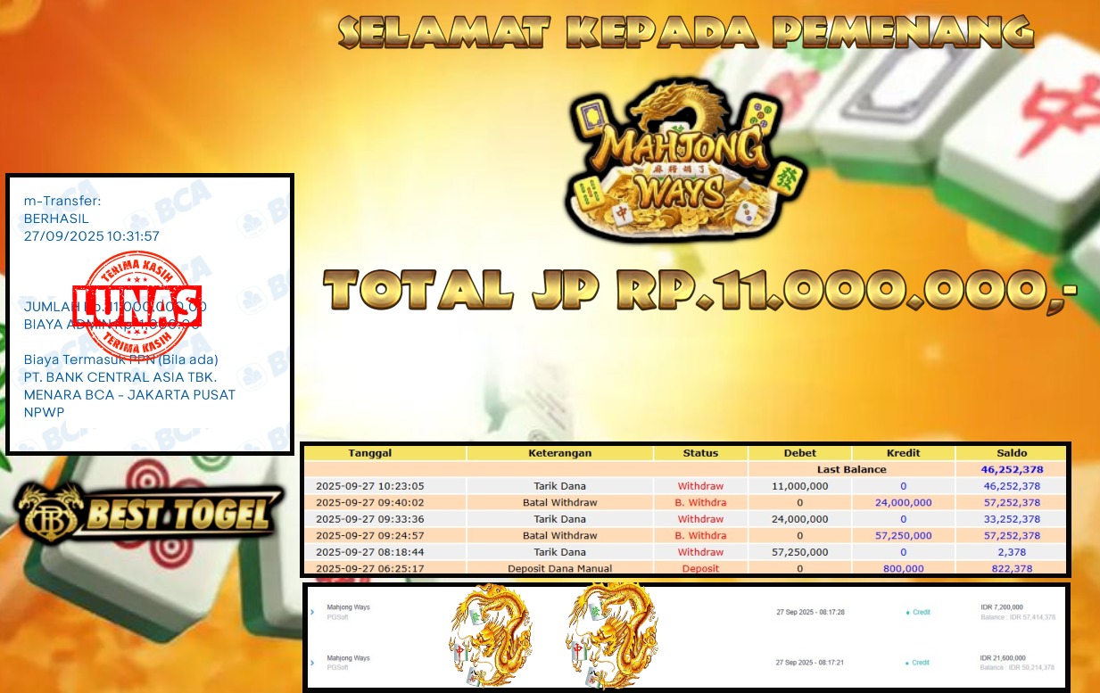 BUKTI JACKPOT SLOT MAHJONG WAYS Rp. 11.000.000,- LUNAS