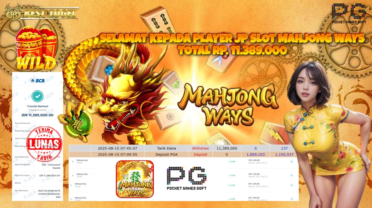kepada User id : JHN***** Telah berhasil mendapatkan kemenangan besar pada permainan SLOT MAHJONG WAYS dengan total kemenangan Sebesar Rp. 11.389.000,00- Setelah mengisi formulir withdraw dengan kurung waktu hanya 5 – 10 menit pihak BESTTOGEL sudah melakukan transfer kepada pemilik Userid dan dana sudah dapat di cairkan oleh pemenang. Bukti pembayaran yang kami berikan merupakan bukti pembayaran yang SAH / VALID yang langung di dapatkan melaui tanda transfer transaksi dari Bank yang di tuju.