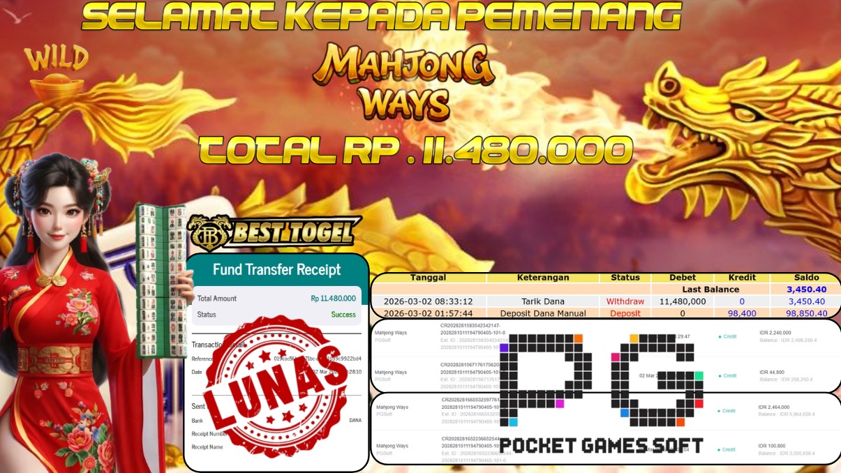 Selamat kepada User id : XIE****** Telah berhasil mendapatkan kemenangan besar pada permainan SLOT MAHJONG WAYS dengan total kemenangan Sebesar Rp. 11.480.000,– Setelah mengisi formulir withdraw dengan kurung waktu hanya 5 – 10 menit pihak BESTTOGEL sudah melakukan transfer kepada pemilik Userid dan dana sudah dapat di cairkan oleh pemenang. Bukti pembayaran yang kami berikan merupakan bukti pembayaran yang SAH / VALID yang langung di dapatkan melaui tanda transfer transaksi dari Bank yang di tuju.