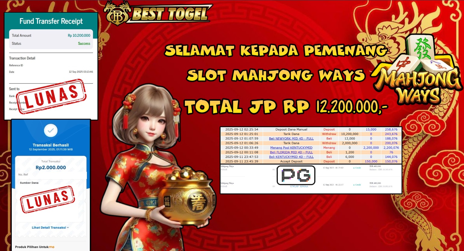kepada User id : AMJ***** Telah berhasil mendapatkan kemenangan besar pada permainan SLOT MAHJONG WAYS dengan total kemenangan Sebesar Rp. 12.200.000,00- Setelah mengisi formulir withdraw dengan kurung waktu hanya 5 – 10 menit pihak BESTTOGEL sudah melakukan transfer kepada pemilik Userid dan dana sudah dapat di cairkan oleh pemenang. Bukti pembayaran yang kami berikan merupakan bukti pembayaran yang SAH / VALID yang langung di dapatkan melaui tanda transfer transaksi dari Bank yang di tuju.