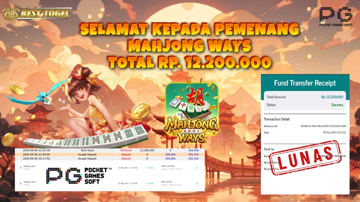 kepada User id : AMT***** Telah berhasil mendapatkan kemenangan besar pada permainan SLOT MAHJONG WAYS dengan total kemenangan Sebesar Rp. 12.200.000,00- Setelah mengisi formulir withdraw dengan kurung waktu hanya 5 – 10 menit pihak BESTTOGEL sudah melakukan transfer kepada pemilik Userid dan dana sudah dapat di cairkan oleh pemenang. Bukti pembayaran yang kami berikan merupakan bukti pembayaran yang SAH / VALID yang langung di dapatkan melaui tanda transfer transaksi dari Bank yang di tuju.