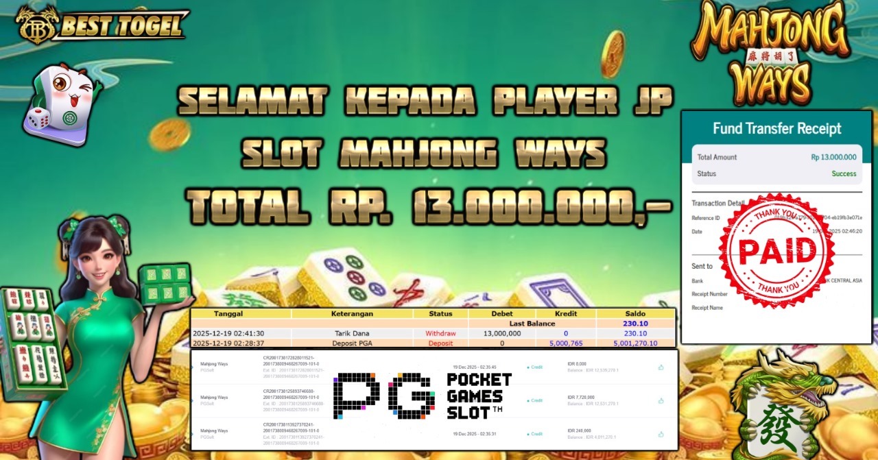 BUKTI JACKPOT SLOT MAHJONG WAYS RP.13.000.000- LUNAS