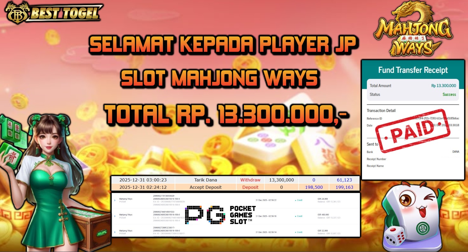 Selamat kepada User id : USR****** Telah berhasil mendapatkan kemenangan besar pada permainan SLOT MAHJONG WAYS dengan total kemenangan Sebesar Rp. 13.300.000,- Setelah mengisi formulir withdraw dengan kurung waktu hanya 5 – 10 menit pihak BESTTOGEL sudah melakukan transfer kepada pemilik Userid dan dana sudah dapat di cairkan oleh pemenang. Bukti pembayaran yang kami berikan merupakan bukti pembayaran yang SAH / VALID yang langung di dapatkan melaui tanda transfer transaksi dari Bank yang di tuju.