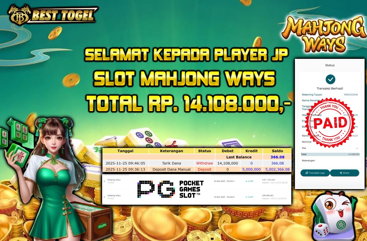 Selamat kepada User id : JST****** Telah berhasil mendapatkan kemenangan besar pada permainan MAHJONG WAYS dengan total kemenangan Sebesar Rp 14.108.000 ,- Setelah mengisi formulir withdraw dengan kurung waktu hanya 5 – 10 menit pihak BESTTOGEL sudah melakukan transfer kepada pemilik Userid dan dana sudah dapat di cairkan oleh pemenang. Bukti pembayaran yang kami berikan merupakan bukti pembayaran yang SAH / VALID yang langung di dapatkan melaui tanda transfer transaksi dari Bank yang di tuju.