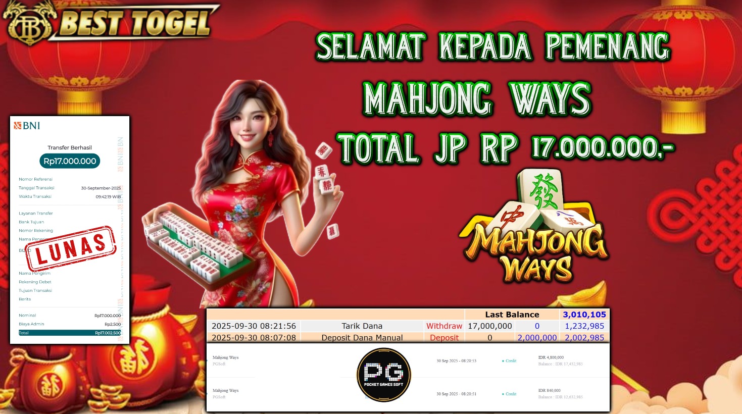 kepada User id : SDW****** Telah berhasil mendapatkan kemenangan besar pada permainan SLOT MAHJONG WAYS dengan total kemenangan Sebesar Rp. 17.000.000,- Setelah mengisi formulir withdraw dengan kurung waktu hanya 5 – 10 menit pihak BESTTOGEL sudah melakukan transfer kepada pemilik Userid dan dana sudah dapat di cairkan oleh pemenang. Bukti pembayaran yang kami berikan merupakan bukti pembayaran yang SAH / VALID yang langung di dapatkan melaui tanda transfer transaksi dari Bank yang di tuju.