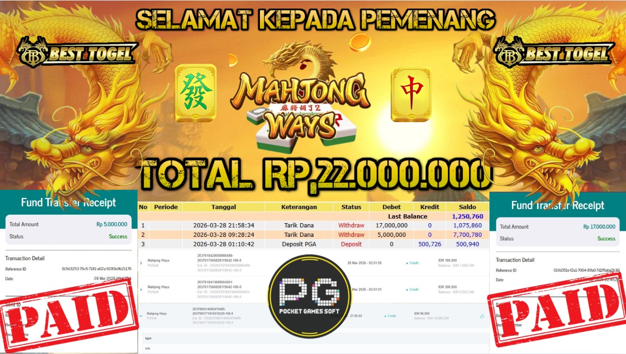 Selamat kepada User id : CUK****** Telah berhasil mendapatkan kemenangan besar pada permainan SLOT MAHJONG WAYS  dengan total kemenangan Sebesar Rp.22.000.000,– Setelah mengisi formulir withdraw dengan kurung waktu hanya 5 – 10 menit pihak  BESTTOGEL sudah melakukan transfer kepada pemilik Userid dan dana sudah dapat di cairkan oleh pemenang. Bukti pembayaran yang kami berikan merupakan bukti pembayaran yang SAH / VALID yang langung di dapatkan melaui tanda transfer transaksi dari Bank yang di tuju.