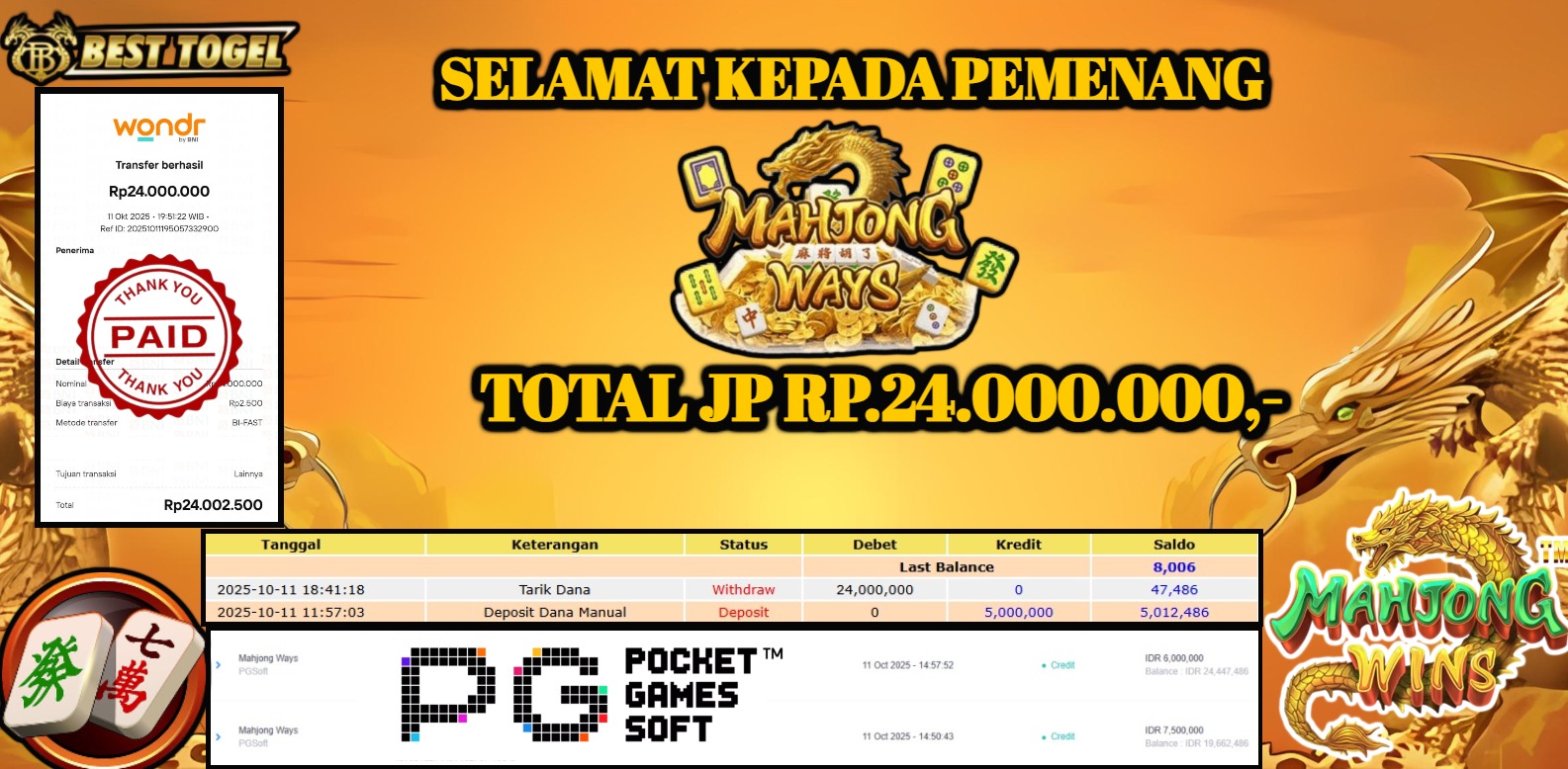 BUKTI JACKPOT SLOT MAHJONG WAYS Rp. 24.000.000,- LUNAS
