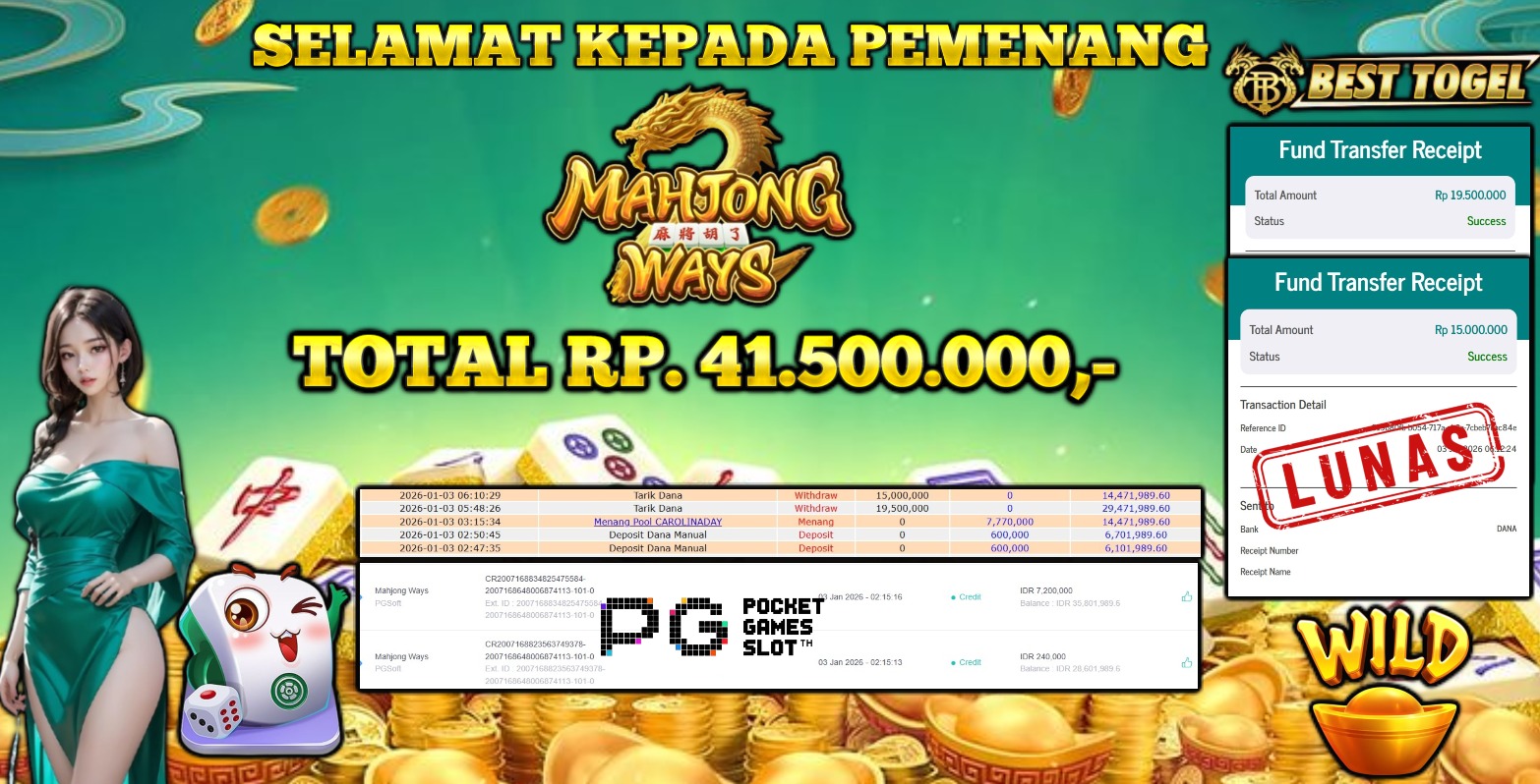Selamat kepada User id : KEN****** Telah berhasil mendapatkan kemenangan besar pada permainan SLOT MAHJONG WAYS dengan total kemenangan Sebesar Rp.41.500.000,- Setelah mengisi formulir withdraw dengan kurung waktu hanya 5 – 10 menit pihak BESTTOGEL sudah melakukan transfer kepada pemilik Userid dan dana sudah dapat di cairkan oleh pemenang. Bukti pembayaran yang kami berikan merupakan bukti pembayaran yang SAH / VALID yang langung di dapatkan melaui tanda transfer transaksi dari Bank yang di tuju.