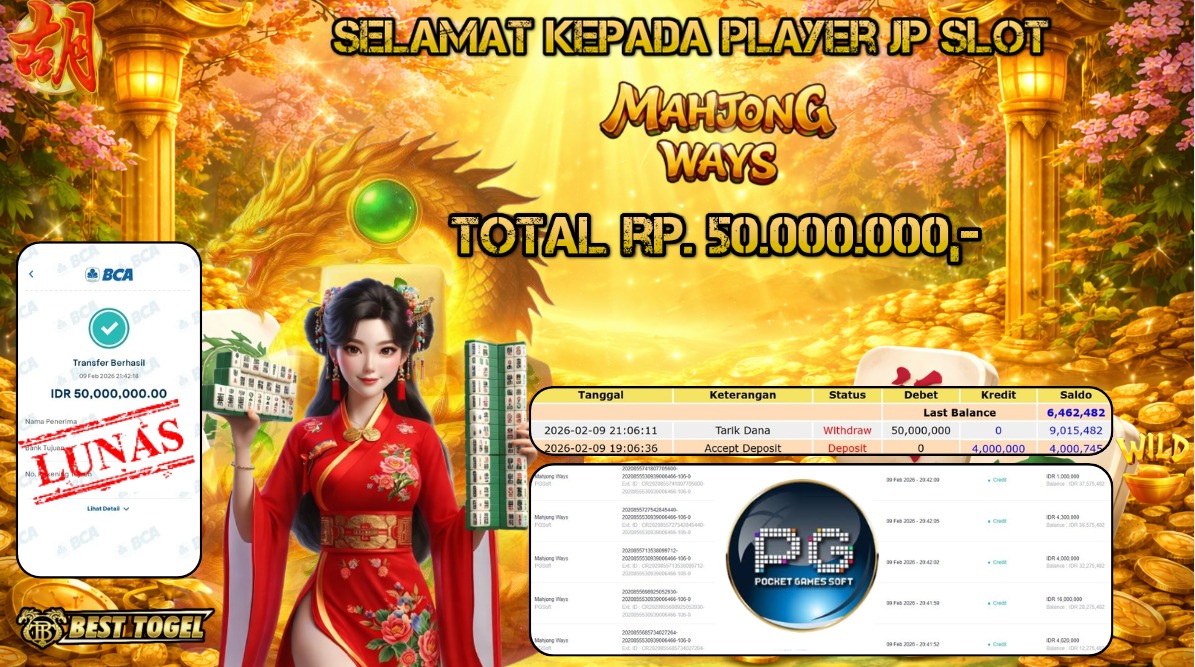 Selamat kepada User id : ALR****** Telah berhasil mendapatkan kemenangan besar pada permainan SLOT MAHJONG WAYS dengan total kemenangan Sebesar Rp.50.000.000,– Setelah mengisi formulir withdraw dengan kurung waktu hanya 5 – 10 menit pihak BESTTOGEL sudah melakukan transfer kepada pemilik Userid dan dana sudah dapat di cairkan oleh pemenang. Bukti pembayaran yang kami berikan merupakan bukti pembayaran yang SAH / VALID yang langung di dapatkan melaui tanda transfer transaksi dari Bank yang di tuju.