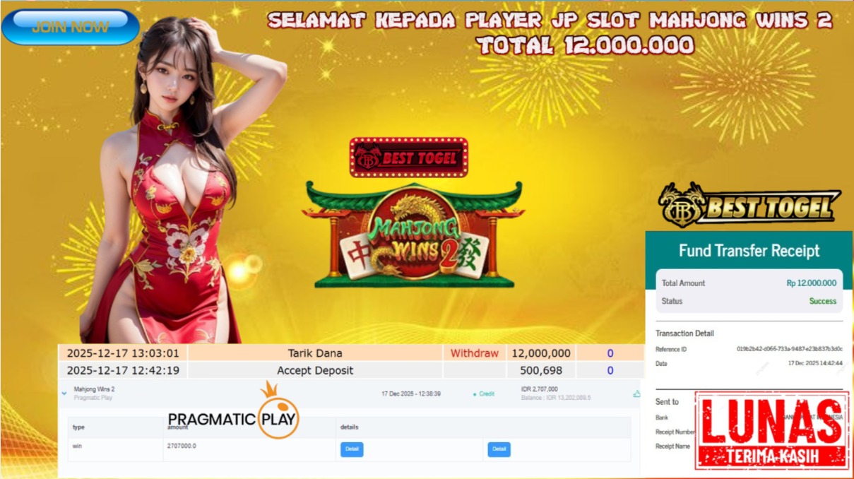 Selamat kepada User id : BAY****** Telah berhasil mendapatkan kemenangan besar pada permainanSLOT MAHJONG WINS 2 dengan total kemenangan Sebesar Rp. 12.000.000 ,- Setelah mengisi formulir withdraw dengan kurung waktu hanya 5 – 10 menit pihak BESTTOGEL sudah melakukan transfer kepada pemilik Userid dan dana sudah dapat di cairkan oleh pemenang. Bukti pembayaran yang kami berikan merupakan bukti pembayaran yang SAH / VALID yang langung di dapatkan melaui tanda transfer transaksi dari Bank yang di tuju.