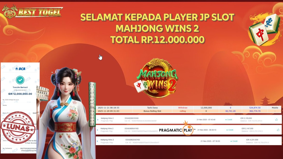 Selamat kepada User id : REK****** Telah berhasil mendapatkan kemenangan besar pada permainan SLOT MAHJONG WINS 2 dengan total kemenangan Sebesar Rp 12.000.000 ,- Setelah mengisi formulir withdraw dengan kurung waktu hanya 5 – 10 menit pihak BESTTOGEL sudah melakukan transfer kepada pemilik Userid dan dana sudah dapat di cairkan oleh pemenang. Bukti pembayaran yang kami berikan merupakan bukti pembayaran yang SAH / VALID yang langung di dapatkan melaui tanda transfer transaksi dari Bank yang di tuju.