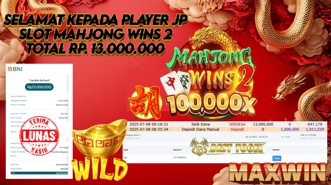 Selamat kepada User id : KEL***** Telah berhasil mendapatkan kemenangan besar pada permainan SLOT MAHJONG WINS 2 dengan total kemenangan Sebesar Rp 13.000.000,- Setelah mengisi formulir withdraw dengan kurung waktu hanya 5 – 10 menit pihak BESTTOGEL sudah melakukan transfer kepada pemilik Userid dan dana sudah dapat di cairkan oleh pemenang. Bukti pembayaran yang kami berikan merupakan bukti pembayaran yang SAH / VALID yang langung di dapatkan melaui tanda transfer transaksi dari Bank yang di tuju.