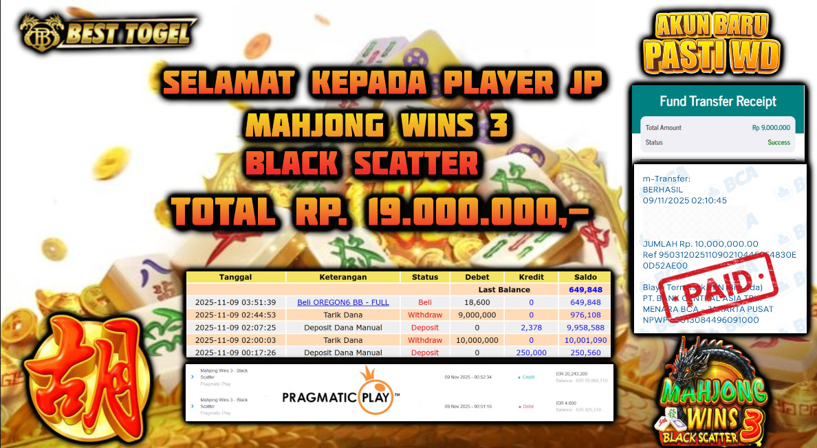 Selamat kepada User id : XIA****** Telah berhasil mendapatkan kemenangan besar pada permainan SLOT MAHJONG WINS 3 – BLACK SCATTER dengan total kemenangan Sebesar Rp 19.000.000 ,- Setelah mengisi formulir withdraw dengan kurung waktu hanya 5 – 10 menit pihak BESTTOGEL sudah melakukan transfer kepada pemilik Userid dan dana sudah dapat di cairkan oleh pemenang. Bukti pembayaran yang kami berikan merupakan bukti pembayaran yang SAH / VALID yang langung di dapatkan melaui tanda transfer transaksi dari Bank yang di tuju.