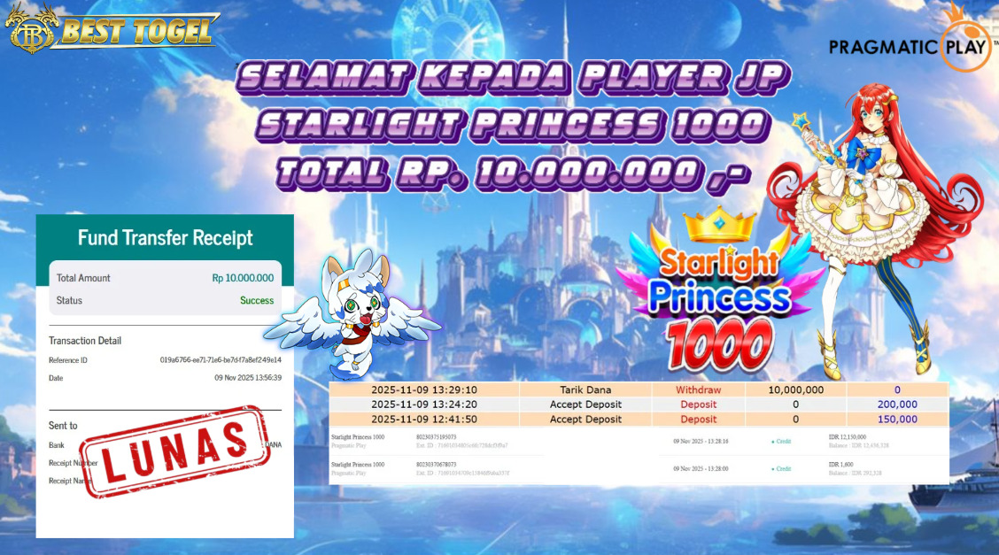 Selamat kepada User id : KWE****** Telah berhasil mendapatkan kemenangan besar pada permainan SLOT STARLIGHT PRINCESS 1000 dengan total kemenangan Sebesar Rp 10.000.000 ,- Setelah mengisi formulir withdraw dengan kurung waktu hanya 5 – 10 menit pihak BESTTOGEL sudah melakukan transfer kepada pemilik Userid dan dana sudah dapat di cairkan oleh pemenang. Bukti pembayaran yang kami berikan merupakan bukti pembayaran yang SAH / VALID yang langung di dapatkan melaui tanda transfer transaksi dari Bank yang di tuju.