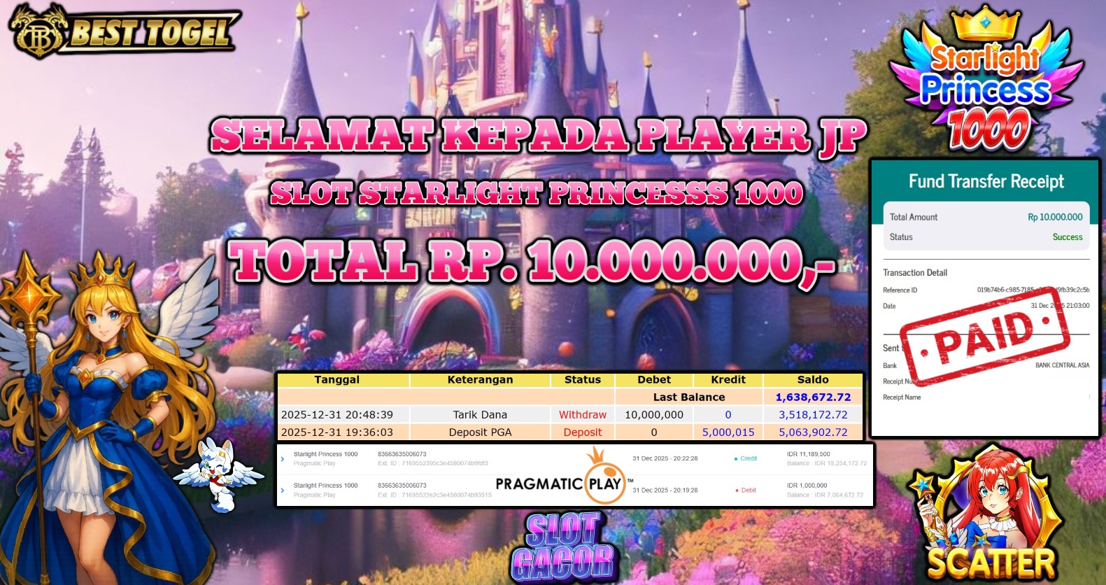 Selamat kepada User id : MEM****** Telah berhasil mendapatkan kemenangan besar pada permainan SLOT STARLIGHT PRINCESS 1000 dengan total kemenangan Sebesar Rp. 10.000.000,- Setelah mengisi formulir withdraw dengan kurung waktu hanya 5 – 10 menit pihak BESTTOGEL sudah melakukan transfer kepada pemilik Userid dan dana sudah dapat di cairkan oleh pemenang. Bukti pembayaran yang kami berikan merupakan bukti pembayaran yang SAH / VALID yang langung di dapatkan melaui tanda transfer transaksi dari Bank yang di tuju.
