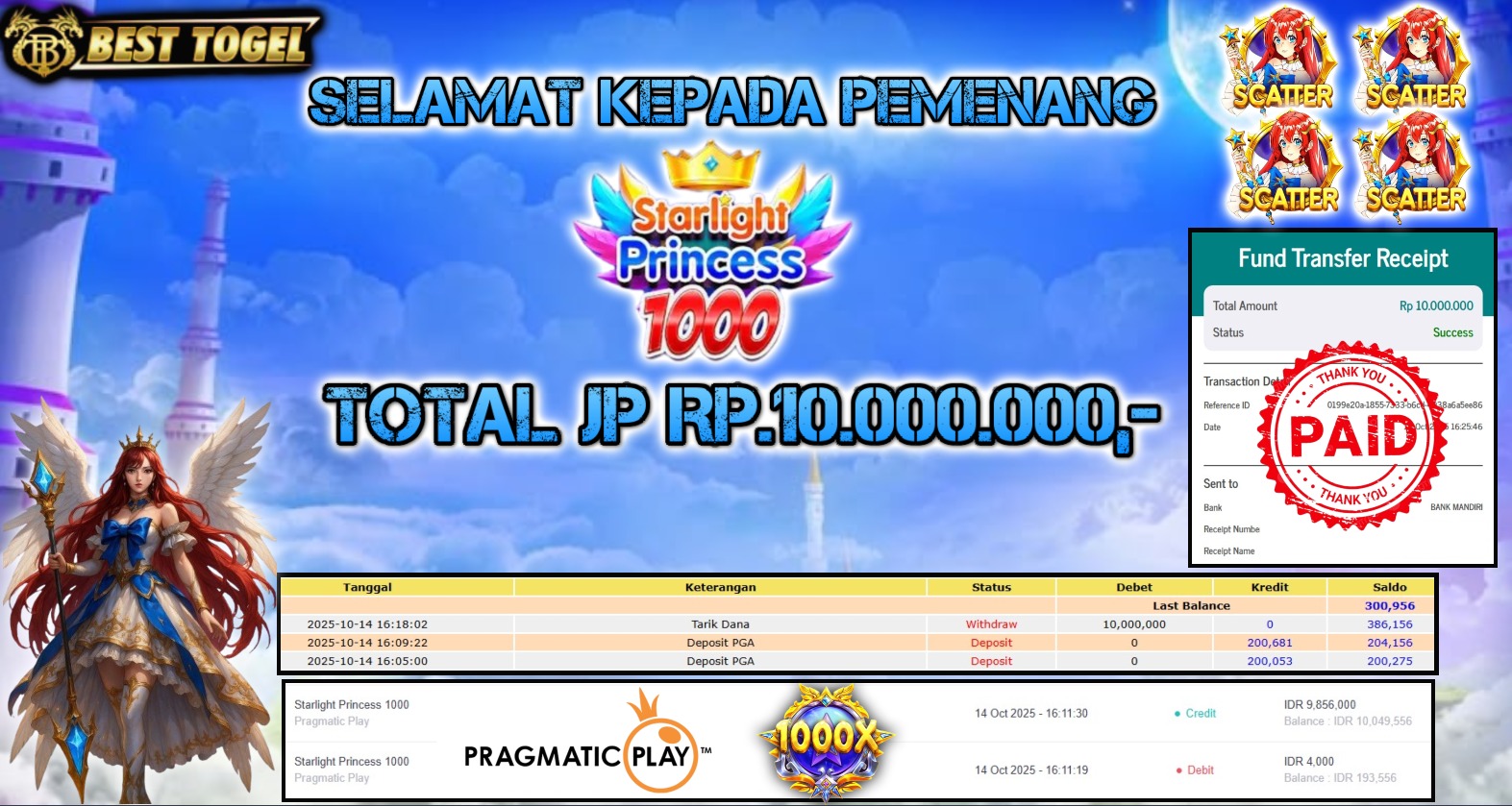 kepada User id : SOY****** Telah berhasil mendapatkan kemenangan besar pada permainan SLOT STARLIGHT PRINCESS 1000 dengan total kemenangan Sebesar Rp. 10.000.000,- Setelah mengisi formulir withdraw dengan kurung waktu hanya 5 – 10 menit pihak BESTTOGEL sudah melakukan transfer kepada pemilik Userid dan dana sudah dapat di cairkan oleh pemenang. Bukti pembayaran yang kami berikan merupakan bukti pembayaran yang SAH / VALID yang langung di dapatkan melaui tanda transfer transaksi dari Bank yang di tuju.