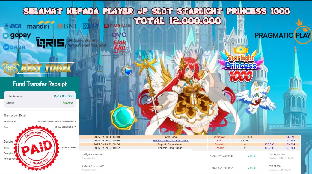 kepada User id : FWS****** Telah berhasil mendapatkan kemenangan besar pada permainan SLOT STARLIGHT PRINCESS 1000 dengan total kemenangan Sebesar Rp. 12.000.000,- Setelah mengisi formulir withdraw dengan kurung waktu hanya 5 – 10 menit pihak BESTTOGEL sudah melakukan transfer kepada pemilik Userid dan dana sudah dapat di cairkan oleh pemenang. Bukti pembayaran yang kami berikan merupakan bukti pembayaran yang SAH / VALID yang langung di dapatkan melaui tanda transfer transaksi dari Bank yang di tuju.