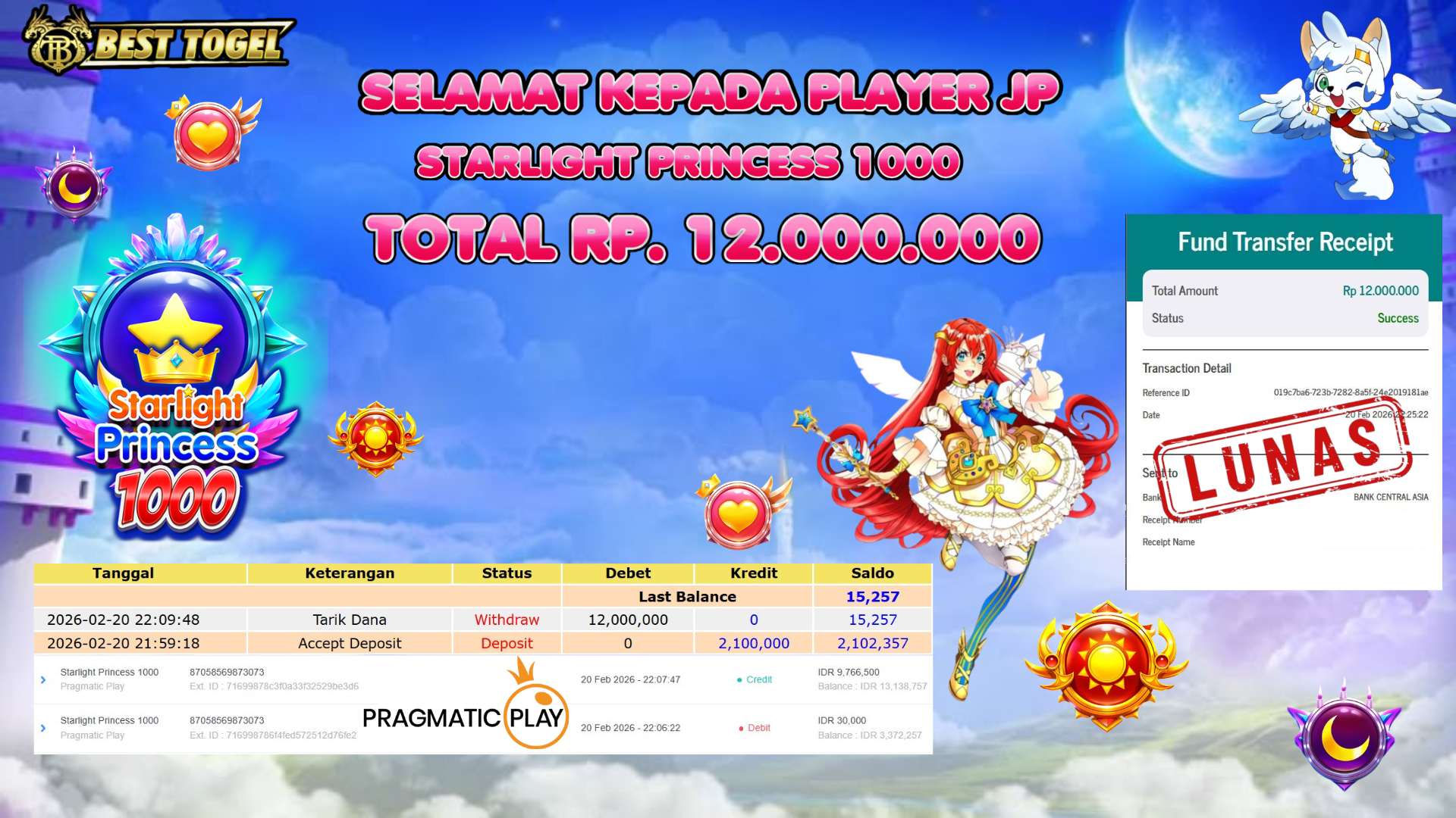 Selamat kepada User id : ANT****** Telah berhasil mendapatkan kemenangan besar pada permainan SLOT STARLIGHT PRINCESS 1000 dengan total kemenangan Sebesar Rp.12.000.000,– Setelah mengisi formulir withdraw dengan kurung waktu hanya 5 – 10 menit pihak BESTTOGEL sudah melakukan transfer kepada pemilik Userid dan dana sudah dapat di cairkan oleh pemenang. Bukti pembayaran yang kami berikan merupakan bukti pembayaran yang SAH / VALID yang langung di dapatkan melaui tanda transfer transaksi dari Bank yang di tuju.