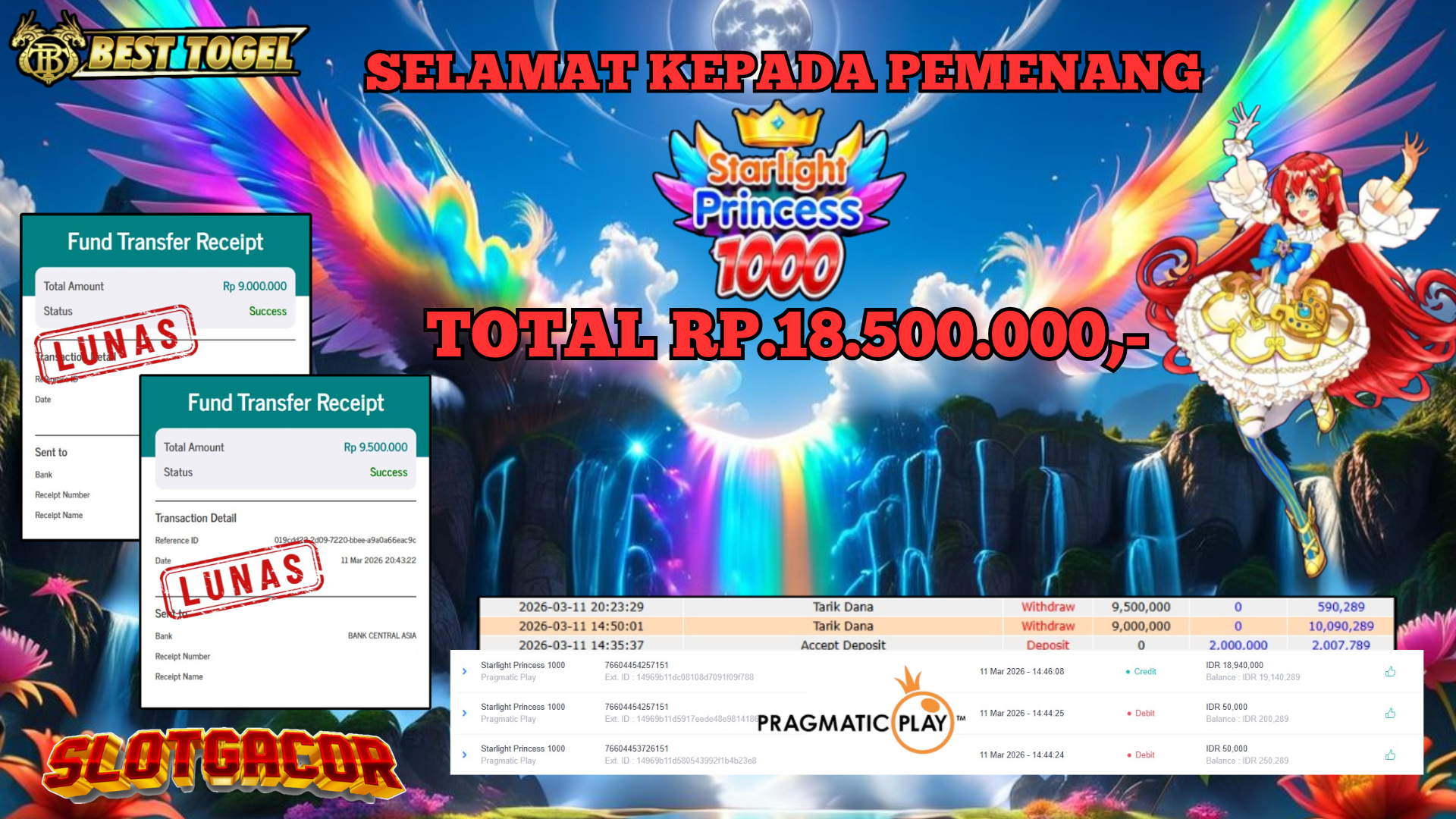 BUKTI JACKPOT SLOT STARLIGHT PRINCESS 1000 RP. 18.500.000,- LUNAS