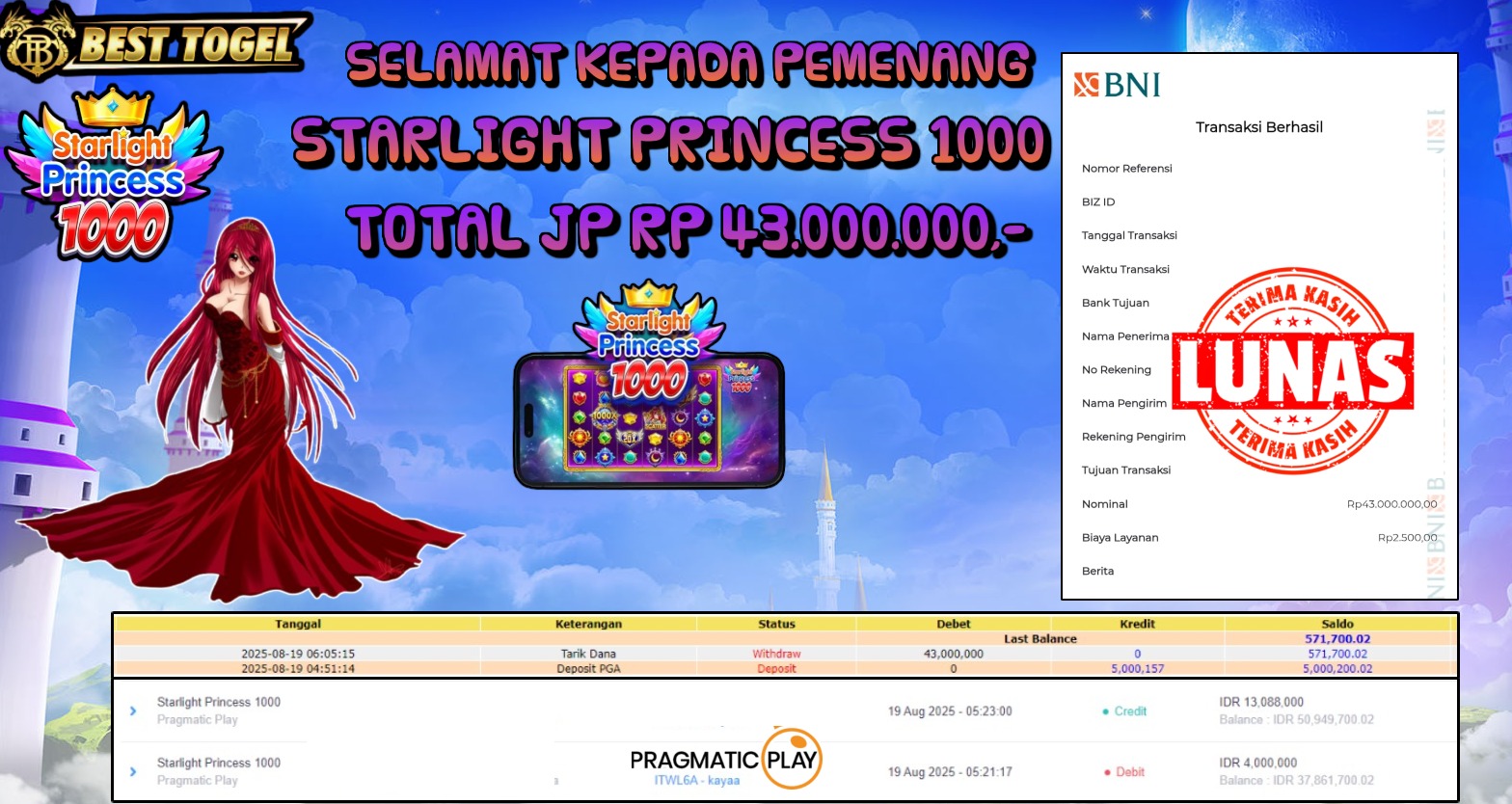 kepada User id : CHY***** Telah berhasil mendapatkan kemenangan besar pada permainan SLOT STARLIGHT PRINCESS 1000 dengan total kemenangan Sebesar Rp. 43.000.000,00- Setelah mengisi formulir withdraw dengan kurung waktu hanya 5 – 10 menit pihak BESTTOGEL sudah melakukan transfer kepada pemilik Userid dan dana sudah dapat di cairkan oleh pemenang. Bukti pembayaran yang kami berikan merupakan bukti pembayaran yang SAH / VALID yang langung di dapatkan melaui tanda transfer transaksi dari Bank yang di tuju.
