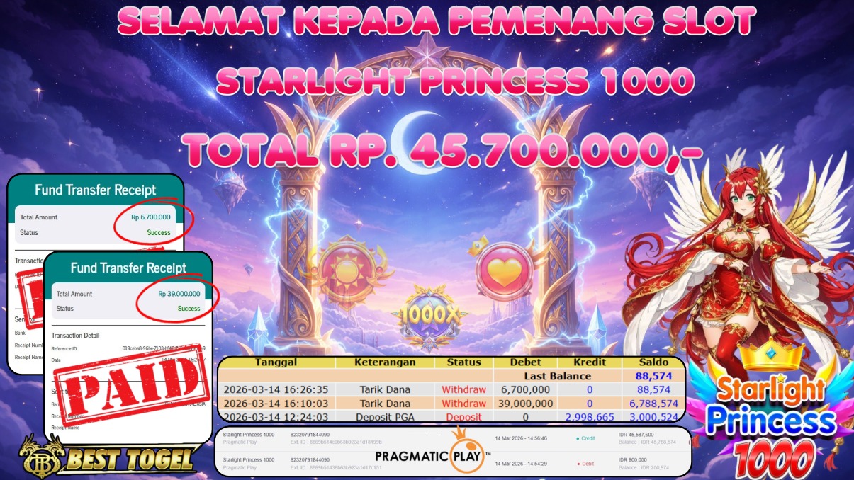 Selamat kepada User id : KAN****** Telah berhasil mendapatkan kemenangan besar pada permainan SLOT STARLIGHT PRINCESS 1000  dengan total kemenangan Sebesar Rp. 45.700.000,– Setelah mengisi formulir withdraw dengan kurung waktu hanya 5 – 10 menit pihak  BESTTOGEL sudah melakukan transfer kepada pemilik Userid dan dana sudah dapat di cairkan oleh pemenang. Bukti pembayaran yang kami berikan merupakan bukti pembayaran yang SAH / VALID yang langung di dapatkan melaui tanda transfer transaksi dari Bank yang di tuju.