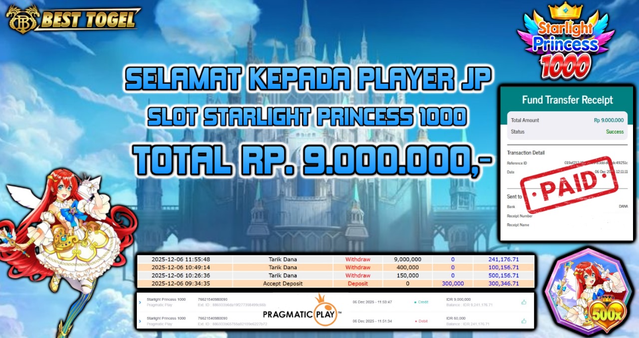 Selamat kepada User id : FJR****** Telah berhasil mendapatkan kemenangan besar pada permainan SLOT STARLIGHT PRINCESS 1000 dengan total kemenangan Sebesar Rp. 9.000.000,- Setelah mengisi formulir withdraw dengan kurung waktu hanya 5 – 10 menit pihak  BESTTOGEL sudah melakukan transfer kepada pemilik Userid dan dana sudah dapat di cairkan oleh pemenang. Bukti pembayaran yang kami berikan merupakan bukti pembayaran yang SAH / VALID yang langung di dapatkan melaui tanda transfer transaksi dari Bank yang di tuju.