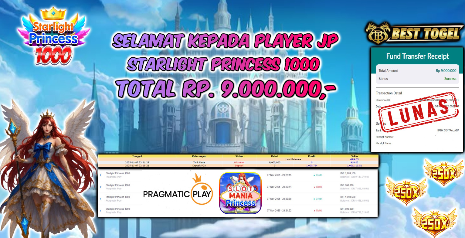 BUKTI JACKPOT SLOT STARLIGHT PRINCESS 1000 Rp. 9.000.000 ,- LUNAS