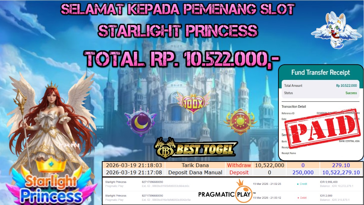 Selamat kepada User id : ALD****** Telah berhasil mendapatkan kemenangan besar pada permainan SLOT STARLIGT PRINCESS dengan total kemenangan Sebesar Rp.10.522.000,– Setelah mengisi formulir withdraw dengan kurung waktu hanya 5 – 10 menit pihak BESTTOGEL sudah melakukan transfer kepada pemilik Userid dan dana sudah dapat di cairkan oleh pemenang. Bukti pembayaran yang kami berikan merupakan bukti pembayaran yang SAH / VALID yang langung di dapatkan melaui tanda transfer transaksi dari Bank yang di tuju.