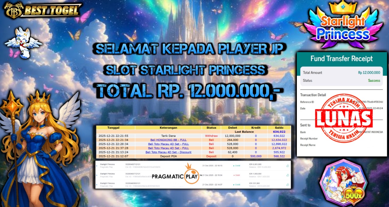Selamat kepada User id : JST****** Telah berhasil mendapatkan kemenangan besar pada permainan SLOT STARLIGHT PRINCESS dengan total kemenangan Sebesar Rp. 12.000.000,- Setelah mengisi formulir withdraw dengan kurung waktu hanya 5 – 10 menit pihak BESTTOGEL sudah melakukan transfer kepada pemilik Userid dan dana sudah dapat di cairkan oleh pemenang. Bukti pembayaran yang kami berikan merupakan bukti pembayaran yang SAH / VALID yang langung di dapatkan melaui tanda transfer transaksi dari Bank yang di tuju.