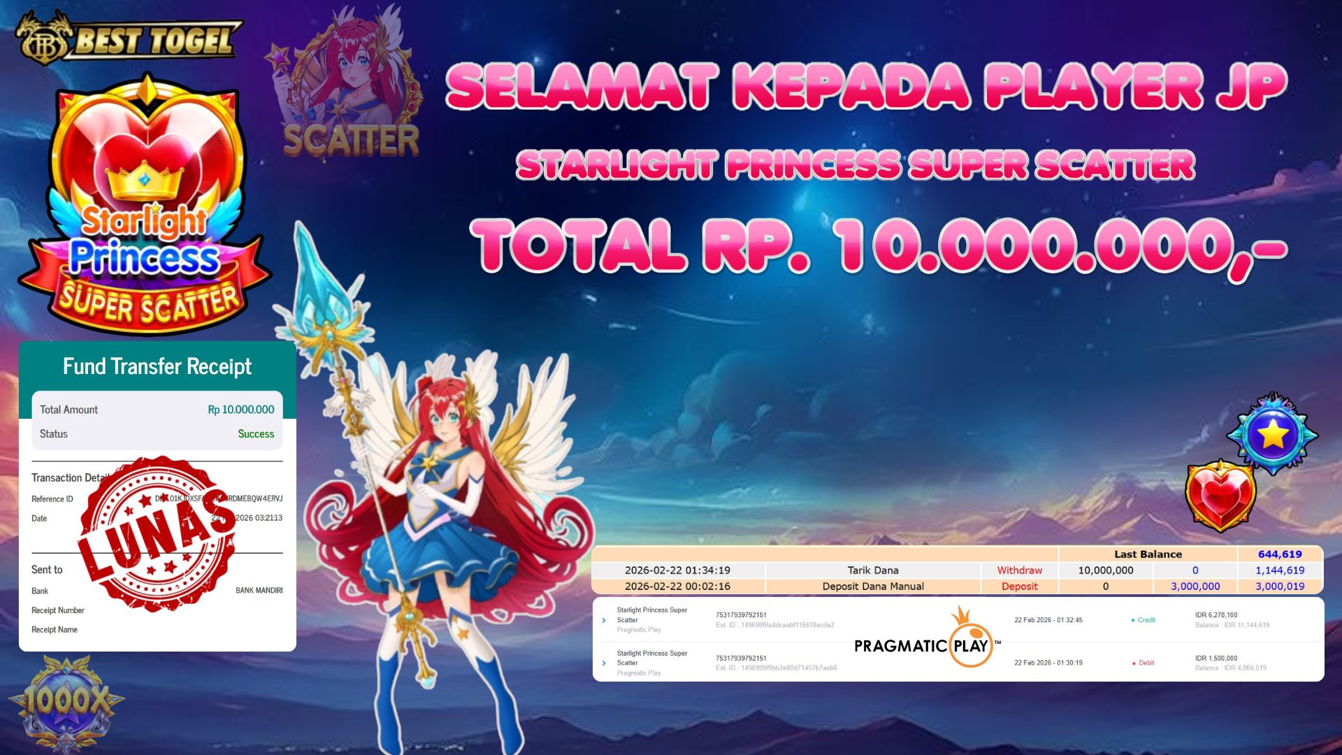 BUKTI JACKPOT SLOT STARLIGHT PRINCESS SUPER SCATTER RP. 10.000.000,- LUNAS