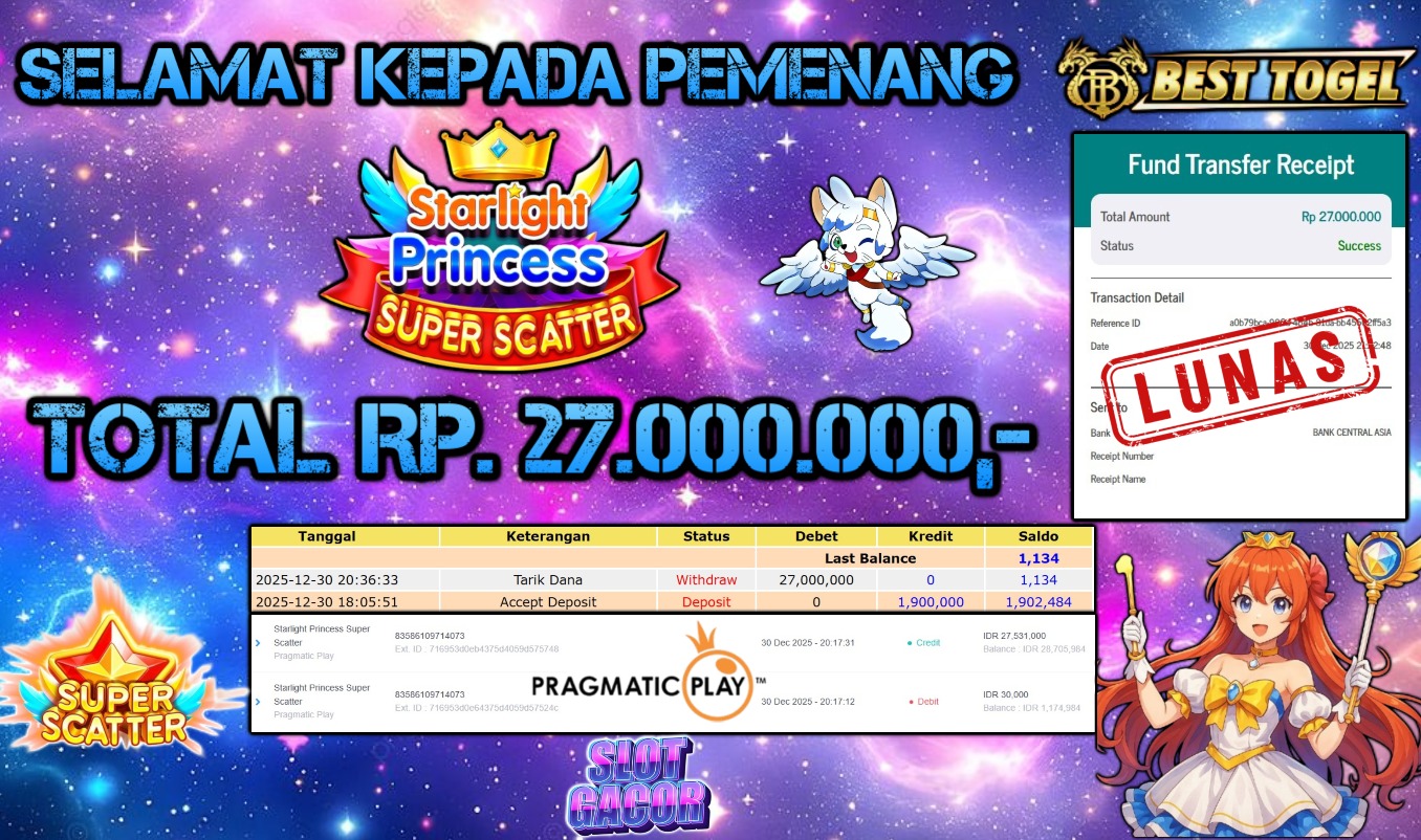 Selamat kepada User id : KEA****** Telah berhasil mendapatkan kemenangan besar pada permainan SLOT STARLIGHT PRINCESS SUPER SCATTER dengan total kemenangan Sebesar Rp. 27.000.000,- Setelah mengisi formulir withdraw dengan kurung waktu hanya 5 – 10 menit pihak BESTTOGEL sudah melakukan transfer kepada pemilik Userid dan dana sudah dapat di cairkan oleh pemenang. Bukti pembayaran yang kami berikan merupakan bukti pembayaran yang SAH / VALID yang langung di dapatkan melaui tanda transfer transaksi dari Bank yang di tuju.